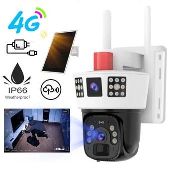 Three Screen Dual Lens Camera Outdoor Use Remote View 4g Lte Solar Battery Ptz Camera Automatic Zoom Rechargeable Security